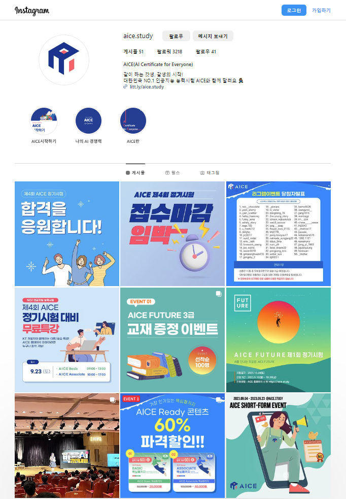 인스타 계정에서 aice 시험 일정, 리그램 이벤트 등 여러가지 새소식도 전해주니 참고하길 바라면서 포스팅을 마친다!