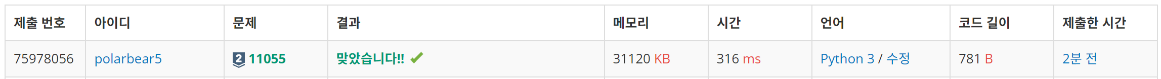 다른 분들은 dp를 2차원이 아니라 1차원으로 바로 합을 넣어 진행하셨다