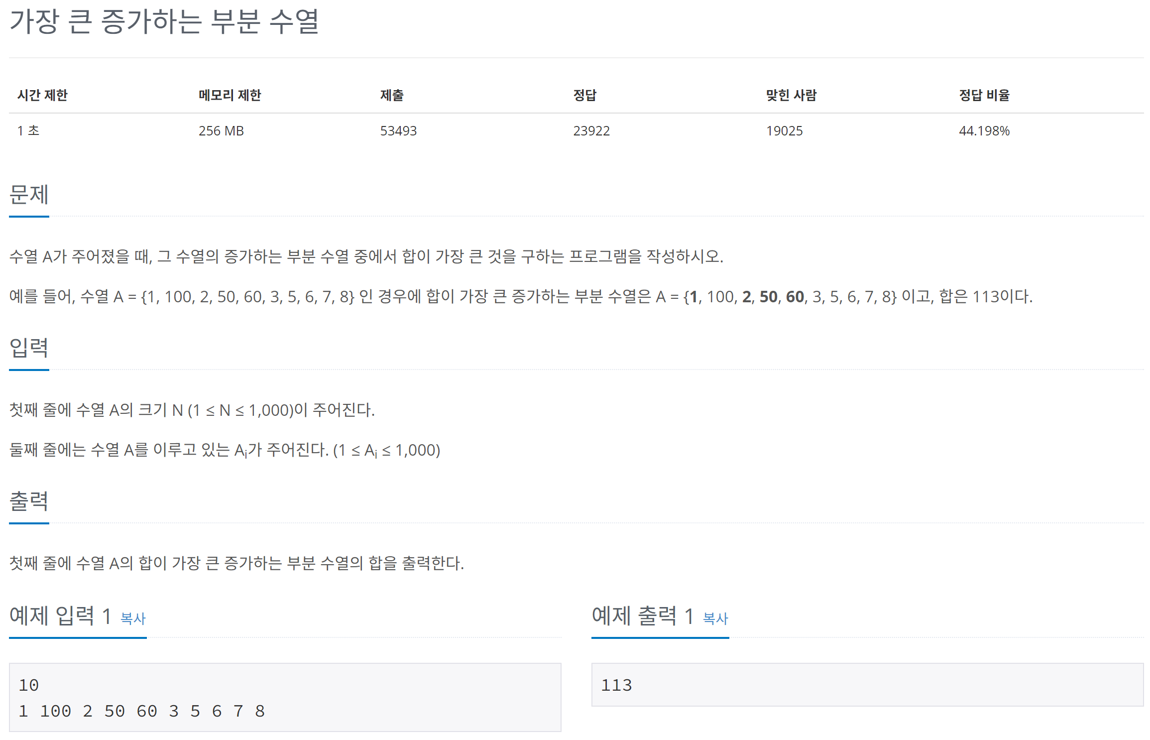 수열 A가 주어졌을 때, 그 수열의 증가하는 부분 수열 중에서 합이 가장 큰 것을 구하는 프로그램을 작성하시오. 예를 들어, 수열 A = {1, 100, 2, 50, 60, 3, 5, 6, 7, 8} 인 경우에 합이 가장 큰 증가하는